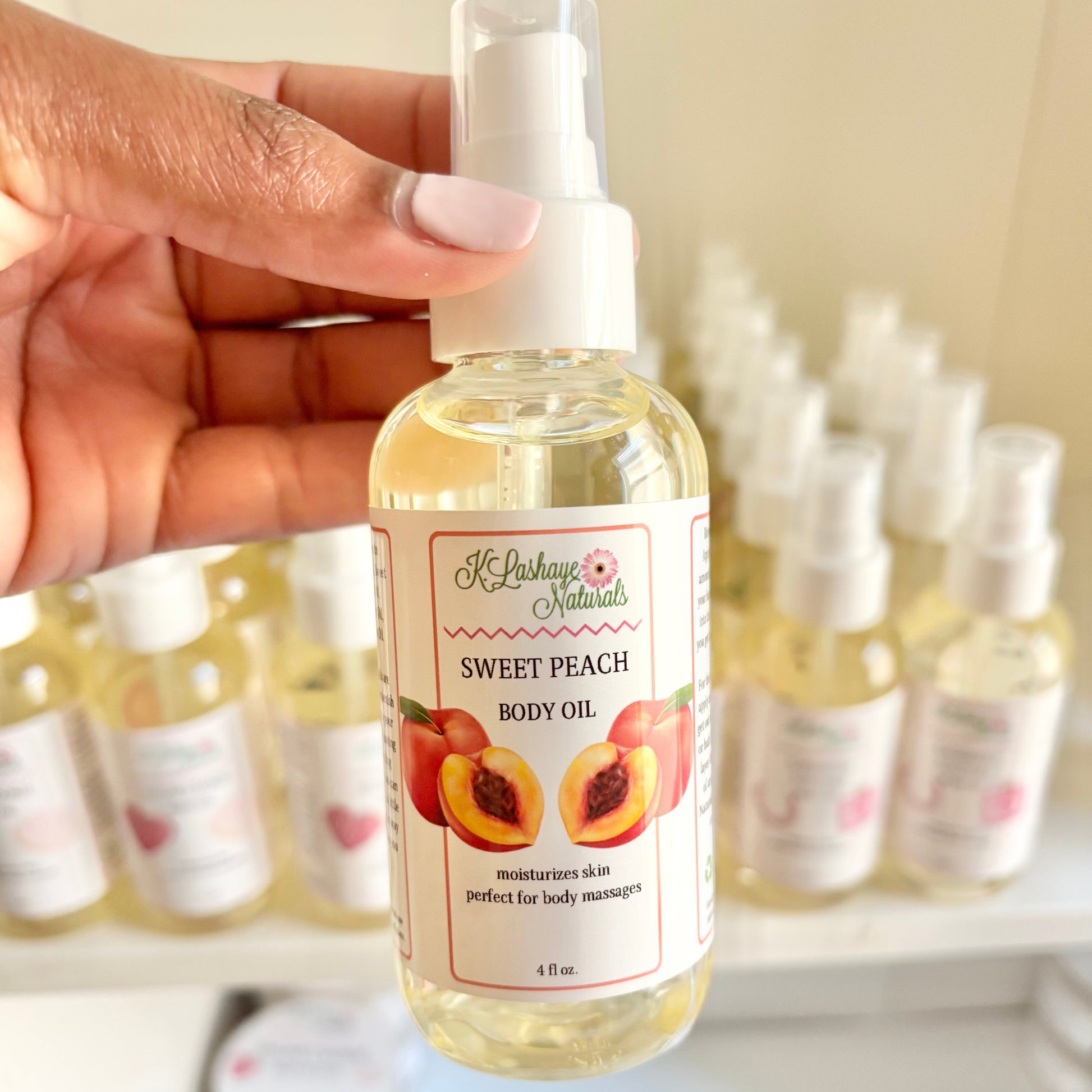 Our Sweet Peach Body Oil is a luxurious blend of natural ingredients, designed to leave your skin feeling moisturized and nourished. It's packed with sunflower oil to hydrate your skin and provide antioxidant protection from environmental stressors. It's lightweight and absorbs quickly, with no greasy residue left behind.