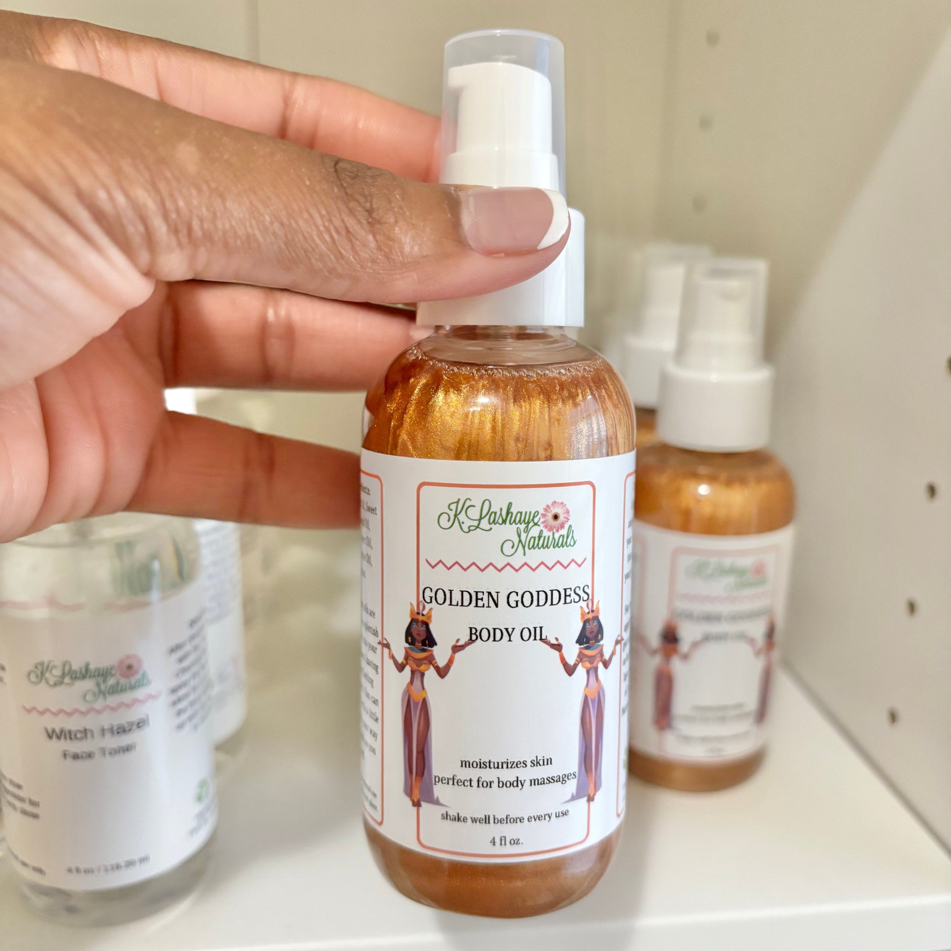 Our Golden Goddess shimmer Body Oil is a luxurious blend of natural ingredients, designed to leave your skin feeling moisturized and nourished. It's packed with sunflower oil to hydrate your skin and provide antioxidant protection from environmental stressors. It's lightweight and absorbs quickly, with no greasy residue left behind.